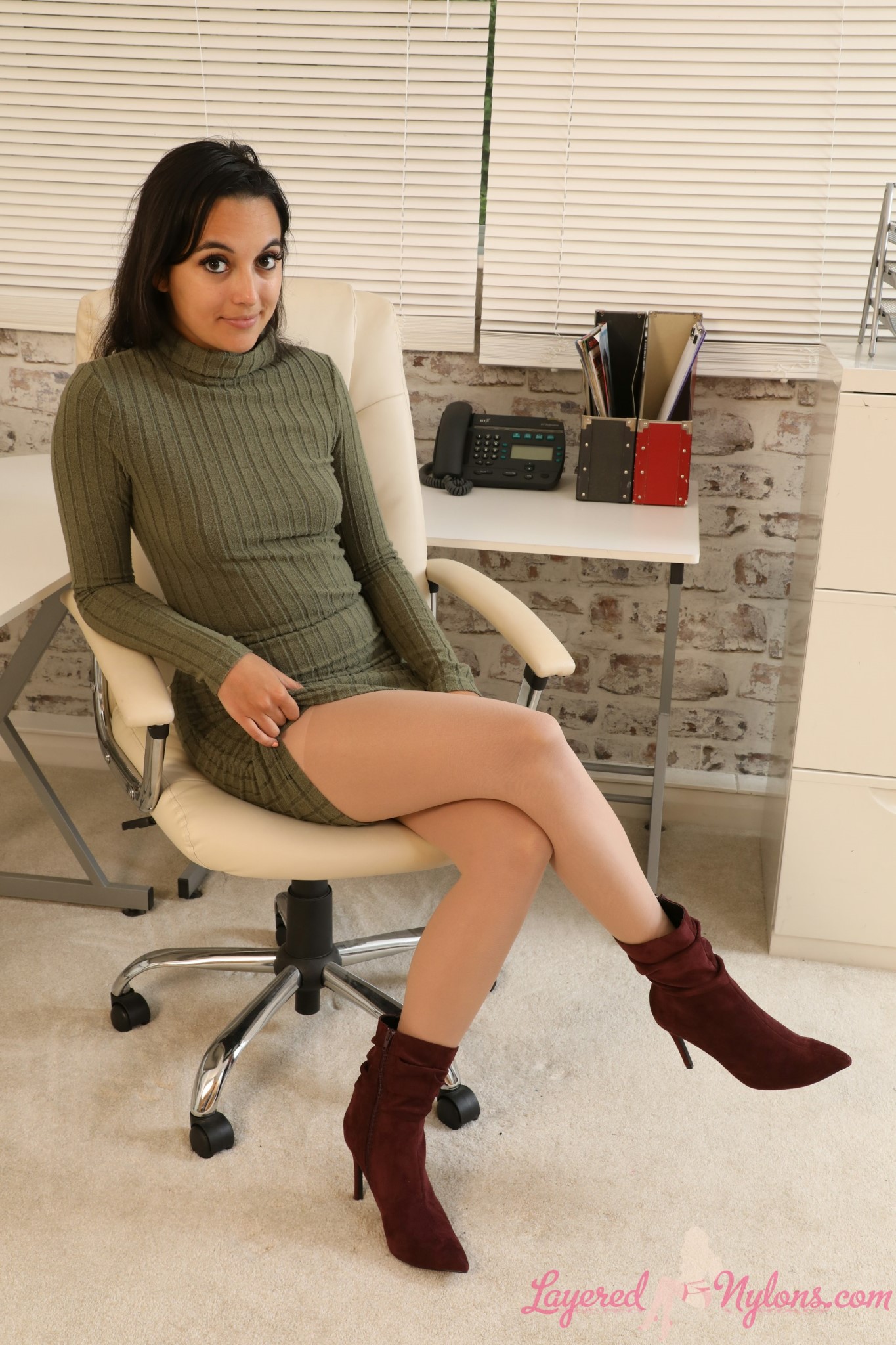 Summer Fox from Layered-Nylons in a minidress and boots with two layers of pantyhose