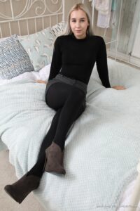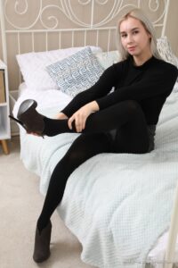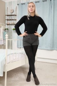 Patricia A from Only Opaques in a shorts with ankle boots and black opaque tights