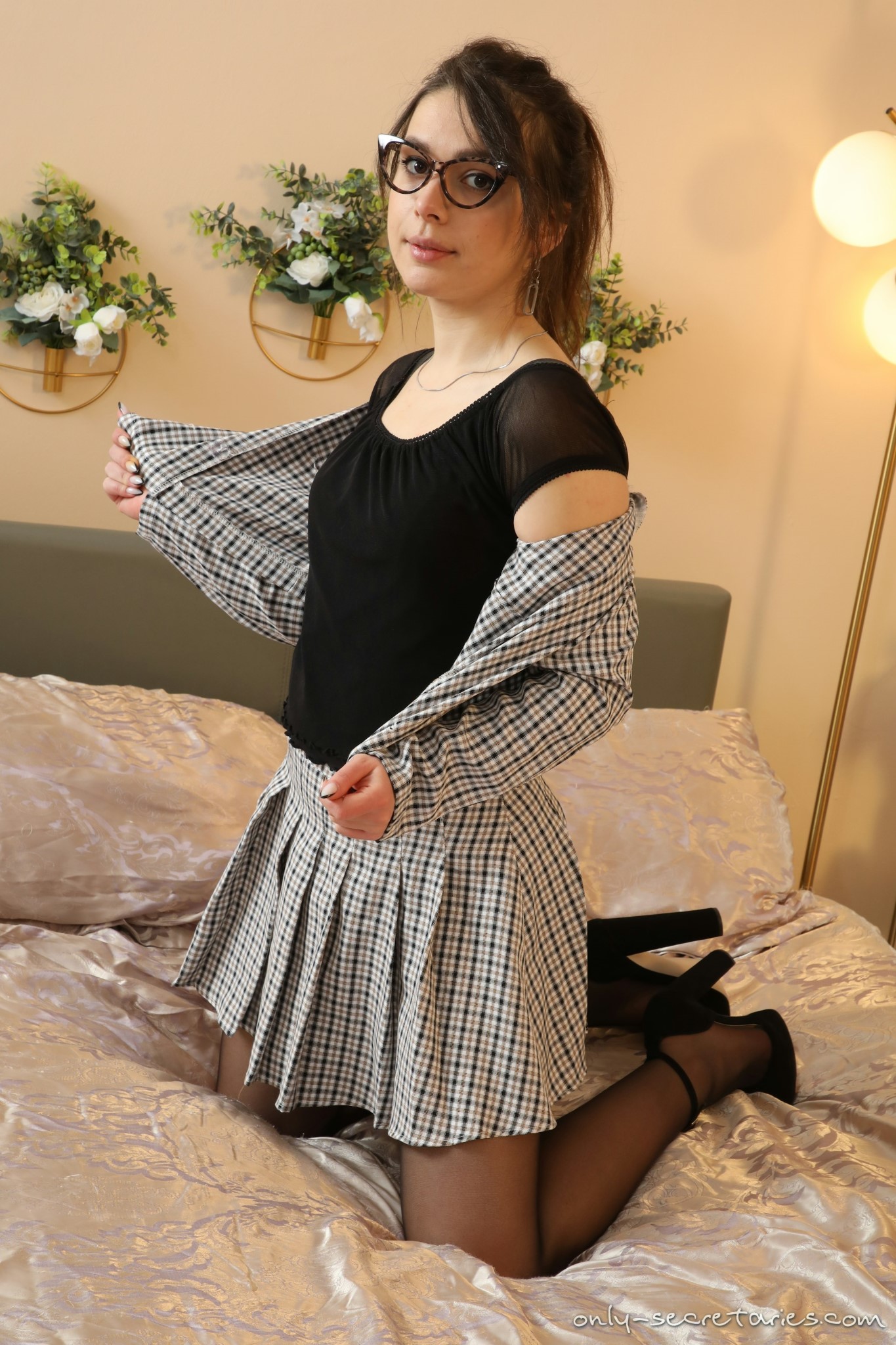Gia from Only Secretaries in a pleated miniskirt with high heels and sheer black stockings