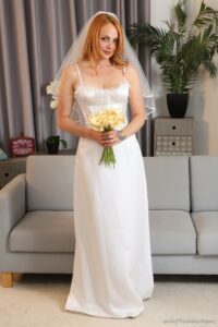 Kara Carter from OnlyTease as a sexy bride in her long white skirt and sheer white stockings