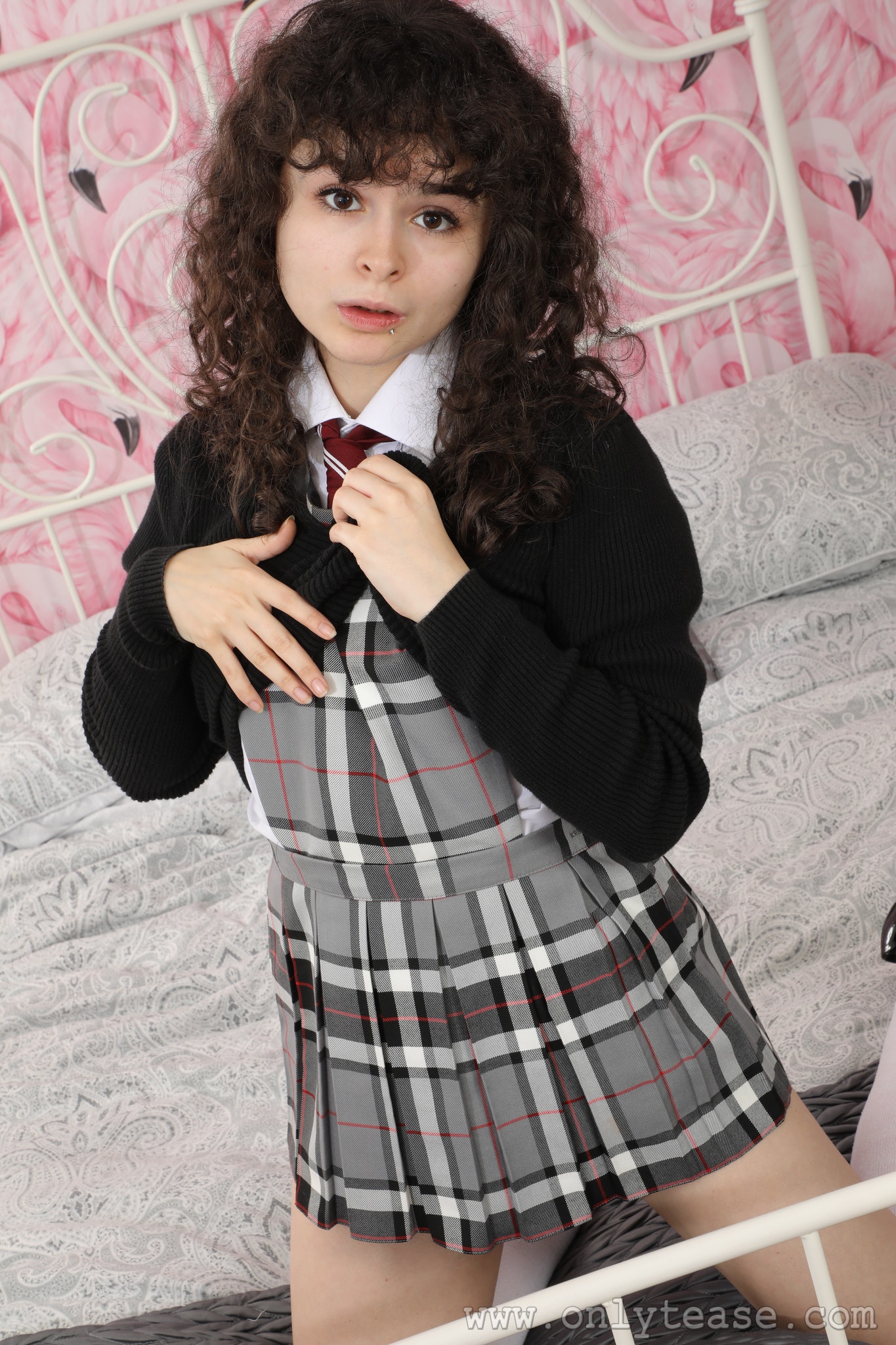 Karen Holster from Only Tease in a college uniform and knee high socks