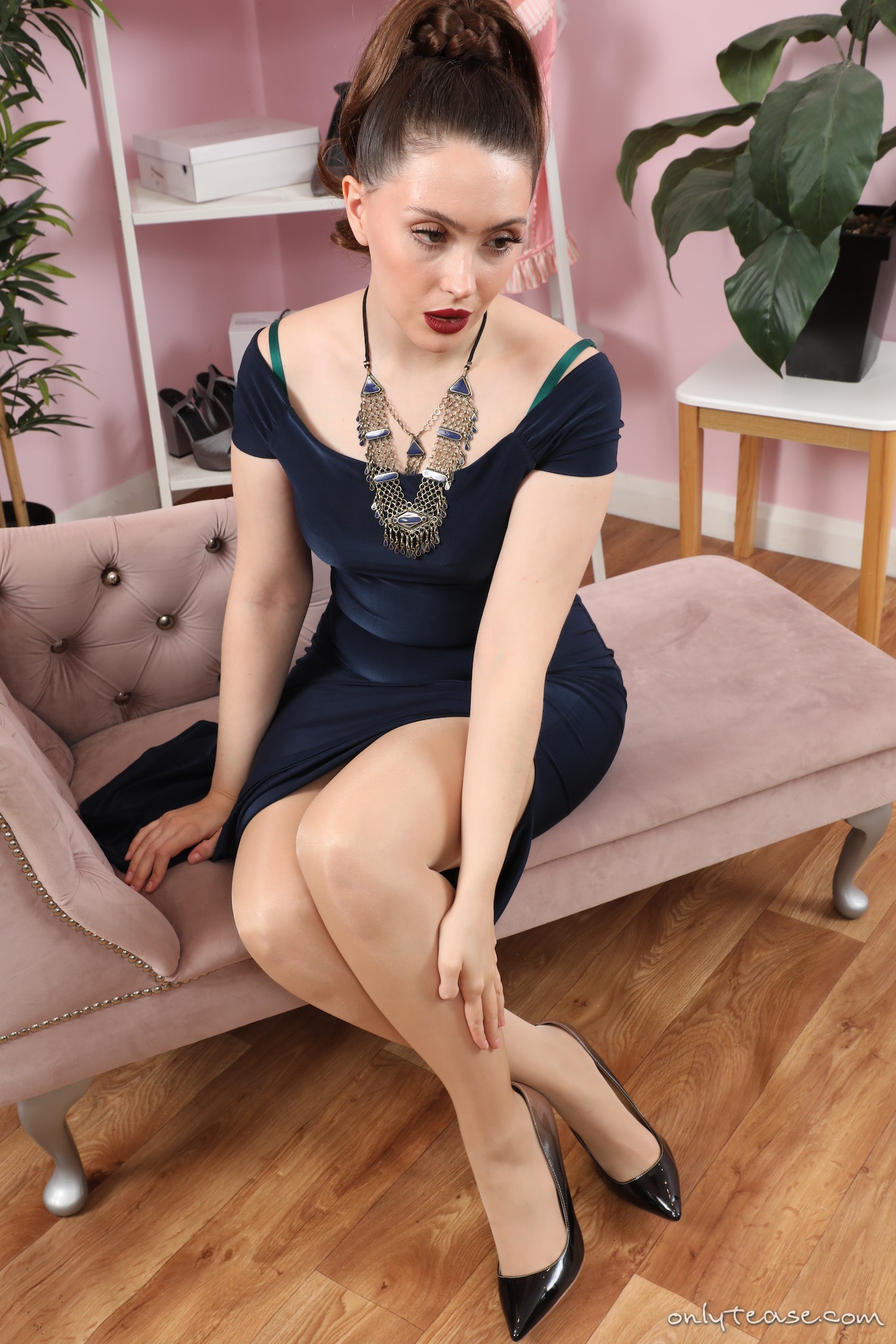 Little Miss Fox from Only Tease looking elegant in her evening dress and sheer pantyhose
