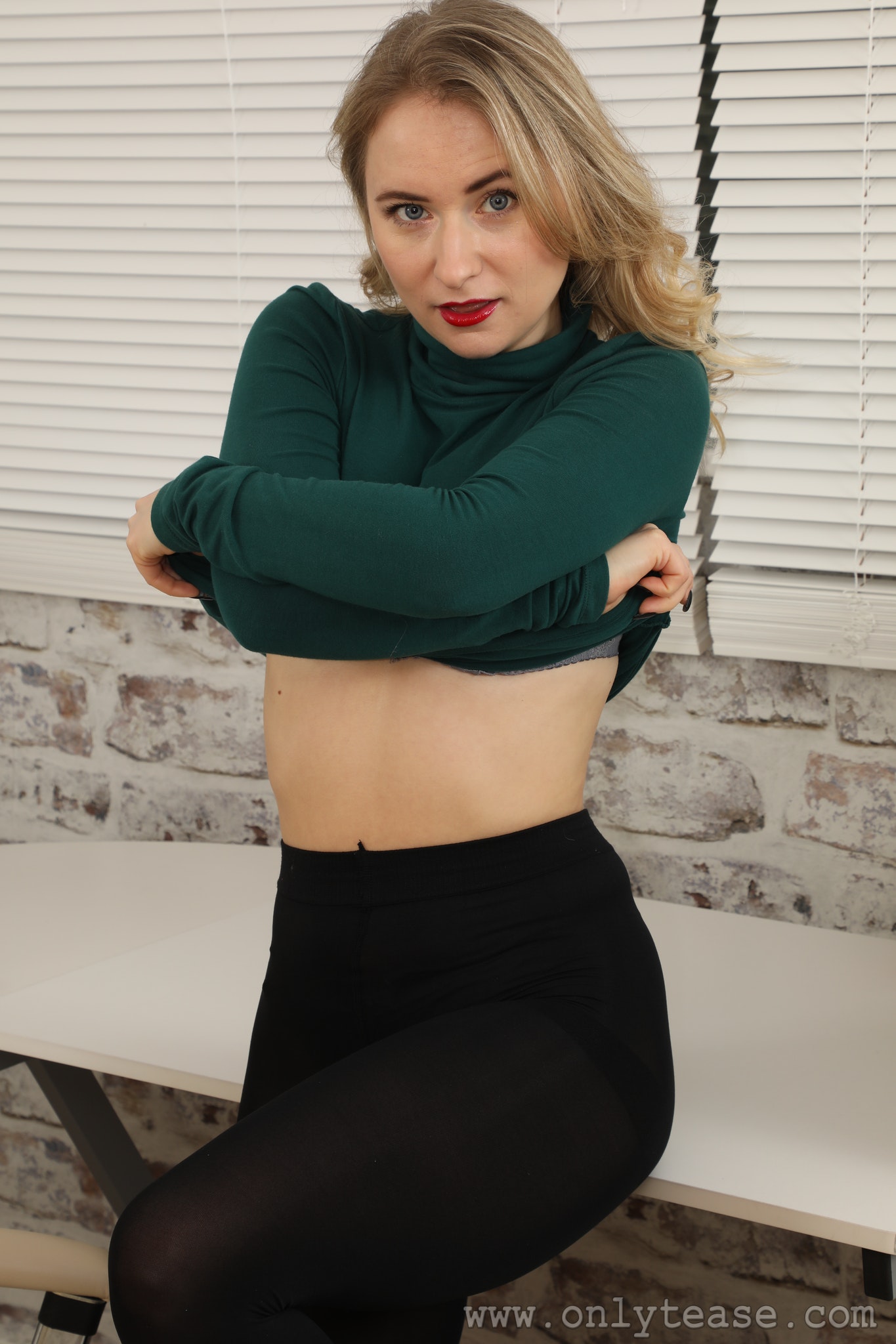 Luna from Only Tease at the office in a minidress and black opaque pantyhose