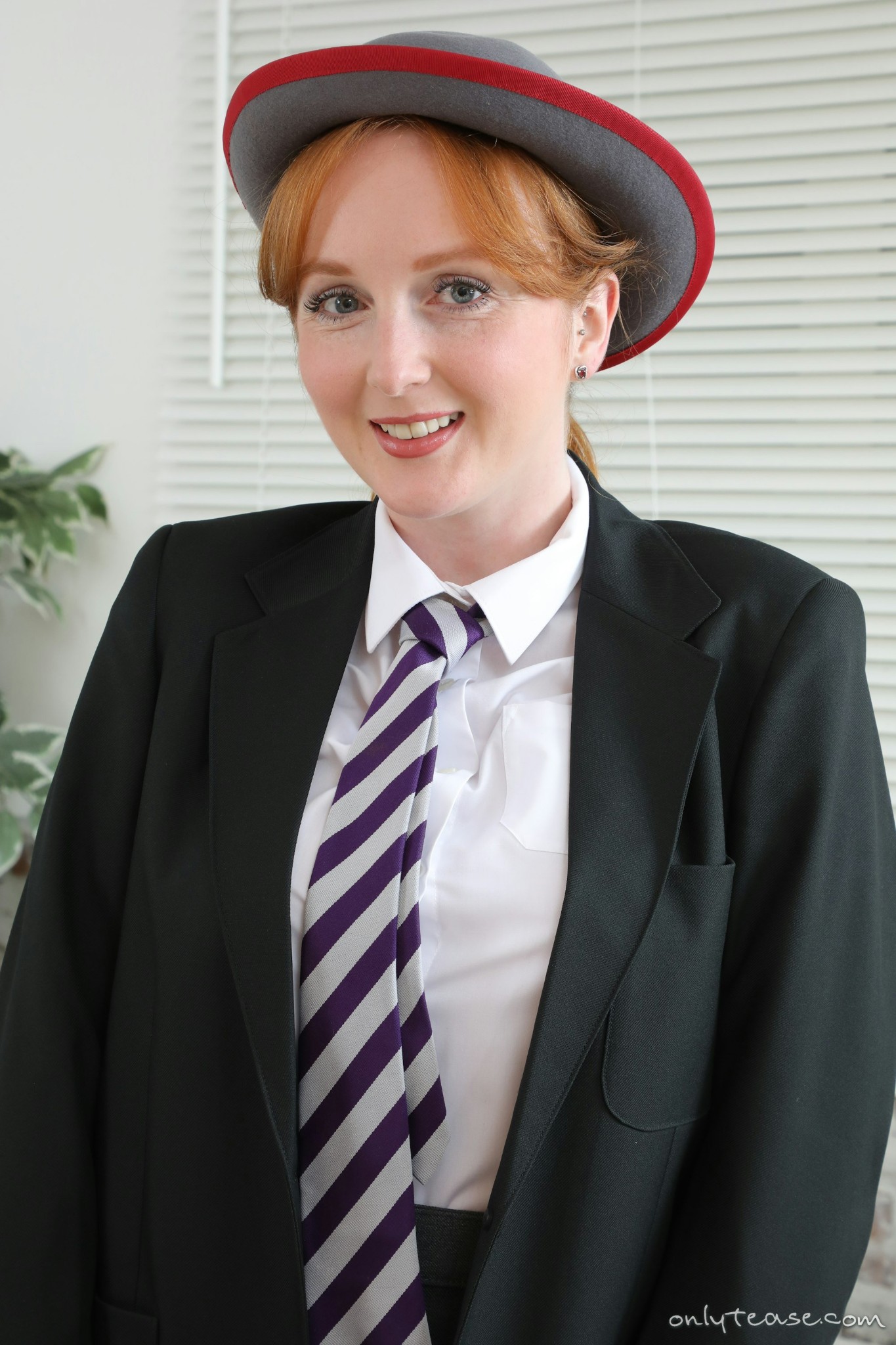 Miss Daphne Red from Only Tease in a college uniform with a short skirt and knee high socks