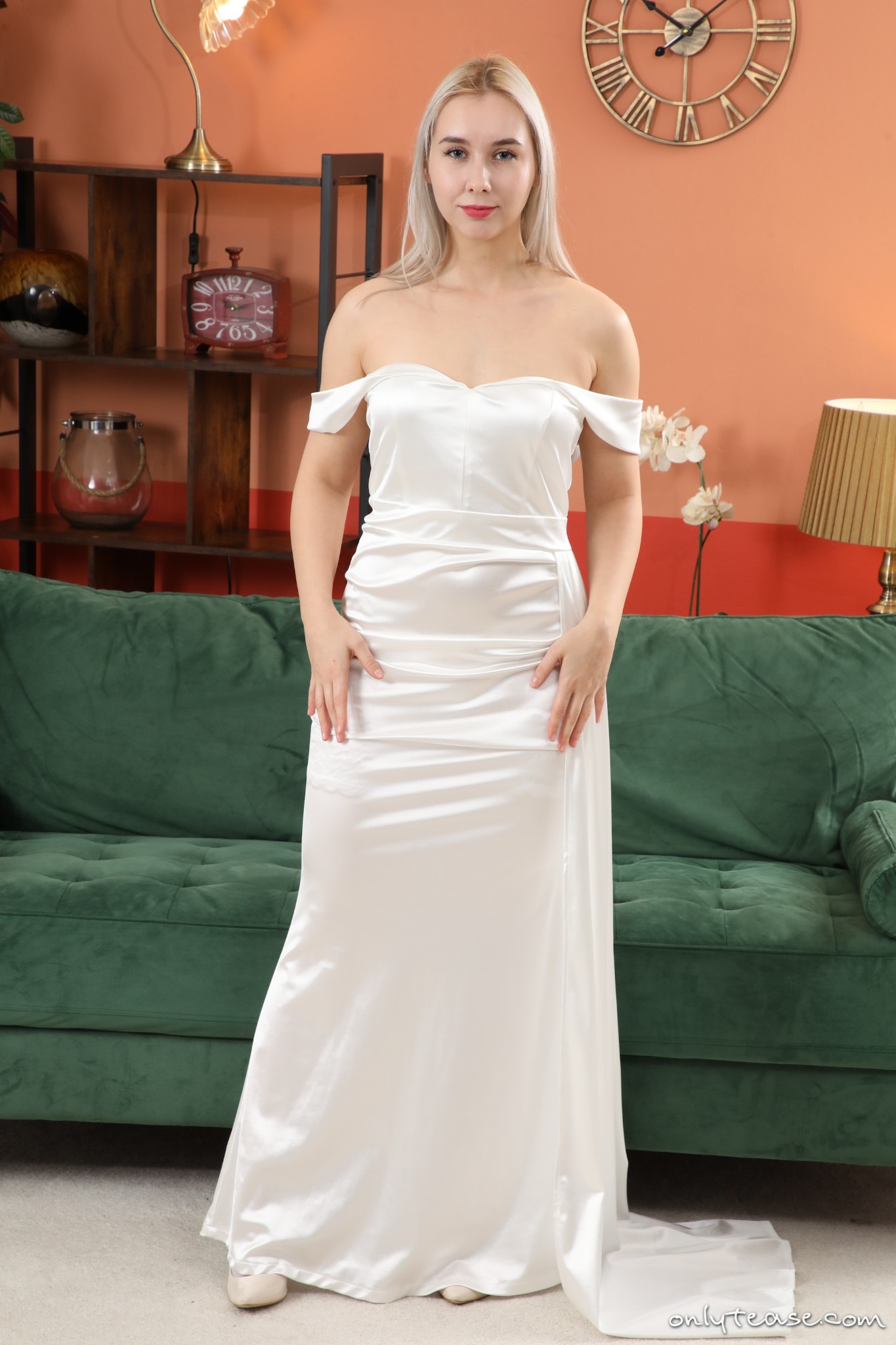 Patricia A from Only Tease as a sexy bride in a bridal gown with high heels and sheer white stockings